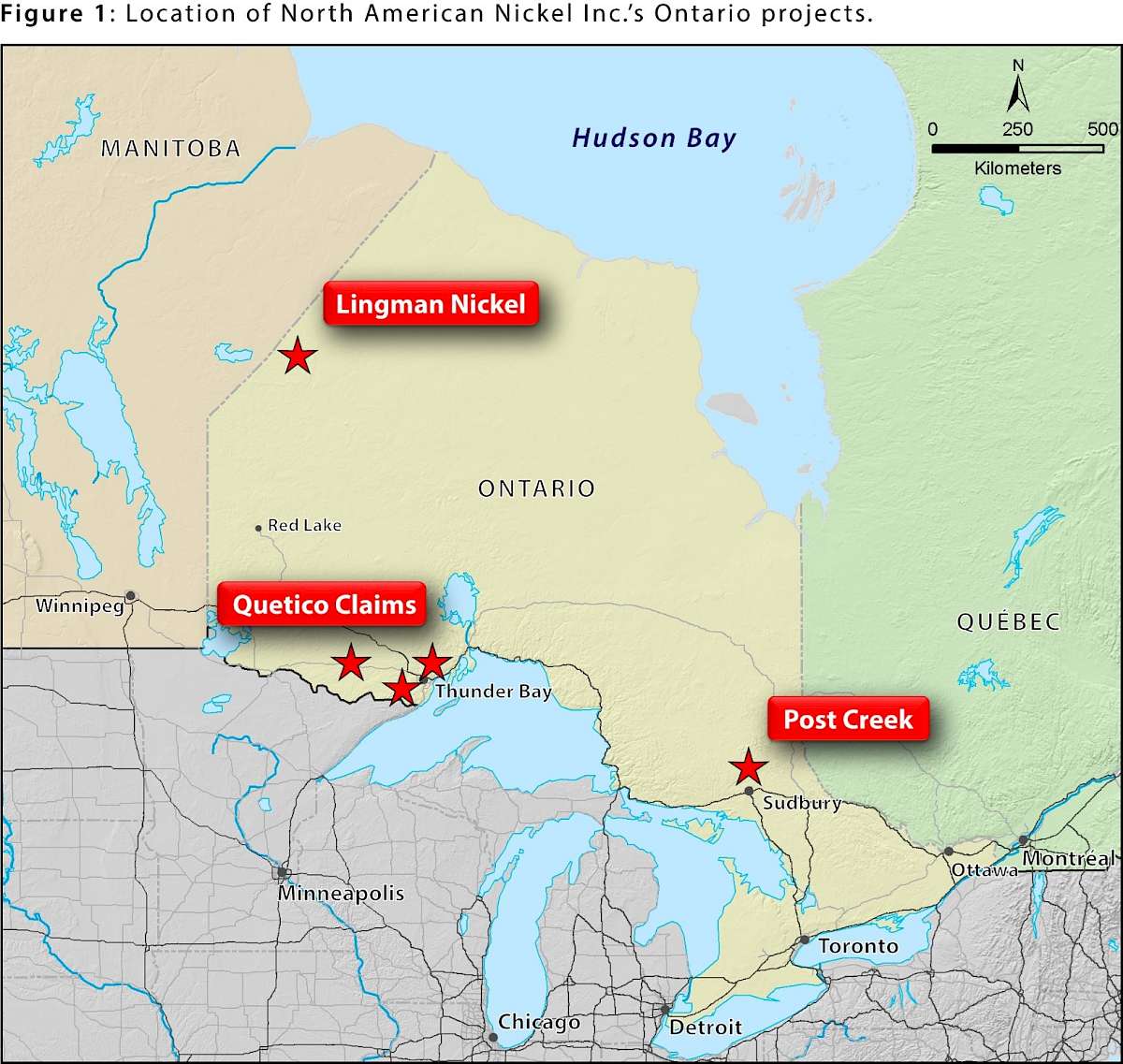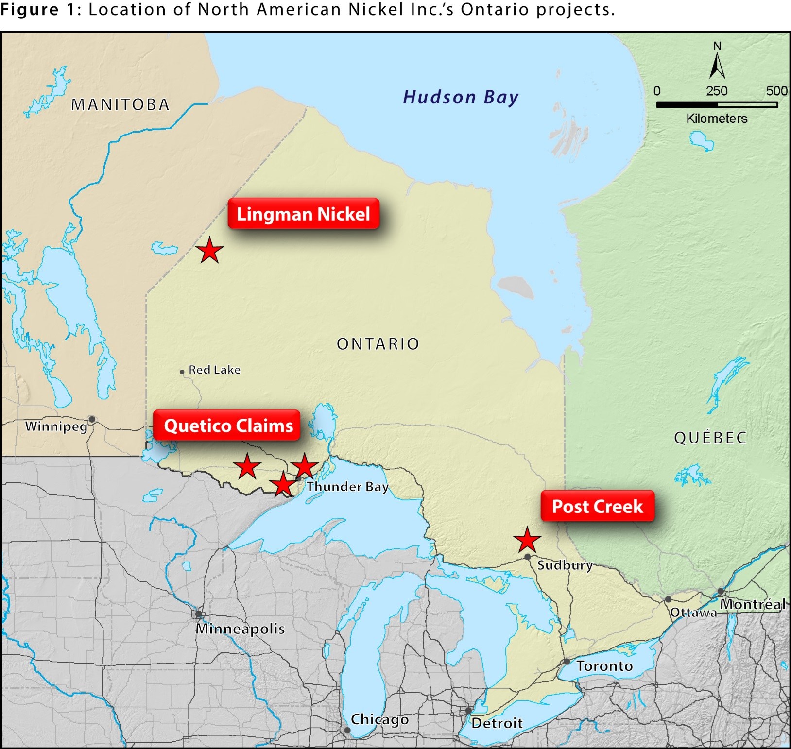 Vancouver, British Columbia--(Newsfile Corp. - May 15, 2019) - North American Nickel Inc. (TSXV: NAN) (OTCBB: WSCRF) (CUSIP: 65704T 108) (the "Company") is pleased to announce that it has acquired 100% ownership of property near the southern extent of the Lingman Lake Greenstone Belt in northwest Ontario, and in the Quetico region near Thunder Bay Ontario. The acquisition of these properties are part of the company's strategy to develop a pipeline of new nickel projects. (Figure 1).