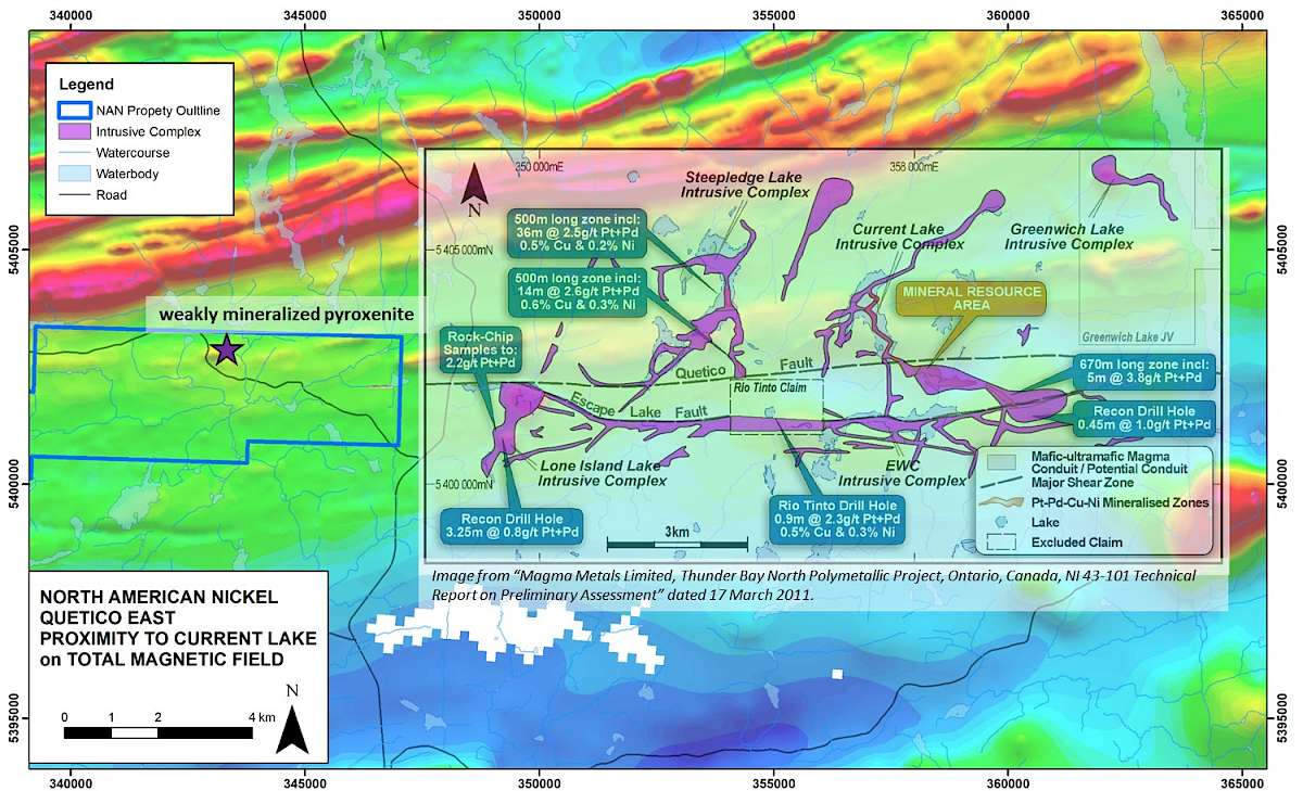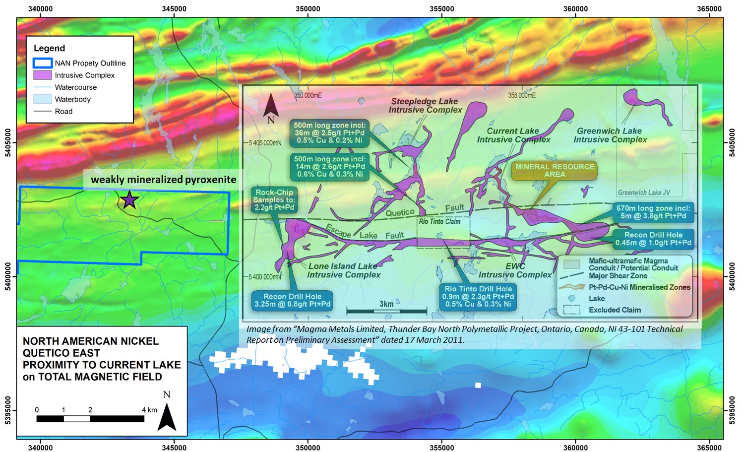 Exploration was focussed on the East block where previous work identified mafic rocks with geochemical signatures similar to those that host the Current Lake deposit, located 10 km to the east (Figure 2). The Current Lake deposit has an Open Pit Indicated Mineral Resource of 8.46 Mt grading 1.04 g/t Pt, 0.98 g/t Pd, 0.25% Cu and 0.18% Ni (2011 NI 43-101 Technical Report, Magma Metals Limited).
