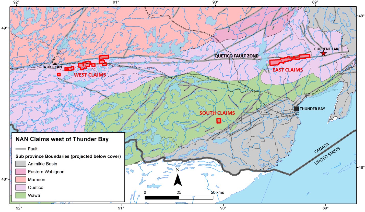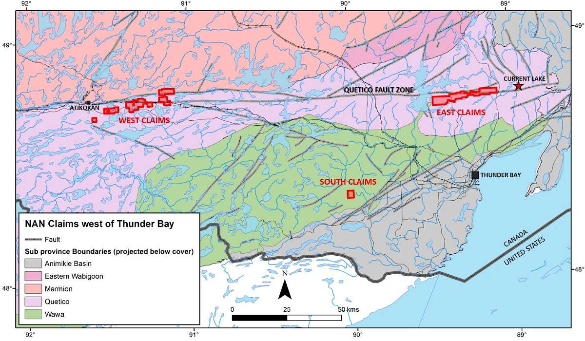 The Company staked a total of 809 claim cells in the Atikokan-Thunder Bay area following project generation and compilation work completed in 2018 (see news release dated May 15, 2019). 400 of these cells are within the Quetico Sub-province corridor, which hosts intrusions with Ni-Cu-Co-precious metal sulphide mineralization related to an ~2.7Ga late-Archean magmatic event. 409 claim cells located in two distinct blocks were acquired to follow-up on prospective magnetic and geochemical anomalies that may be related to early intrusions of the ~1.1Ga mid-continent rift event. Three clusters of claims cells, labeled Quetico South, East and West were acquired in 2018 to cover magnetic and geochemical anomalies that may represent differentiated mafic intrusions localized along splays of the Quetico fault zone (Figure 1).