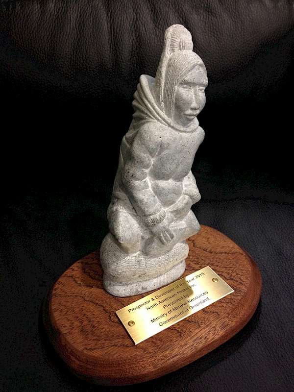 The award-prize is a soapstone figure with the inscription: ’Prospector and Developer of the Year in Greenland 2015, North American Nickel Inc., Presented by the Ministry of Mineral Resources, Government of Greenland’.