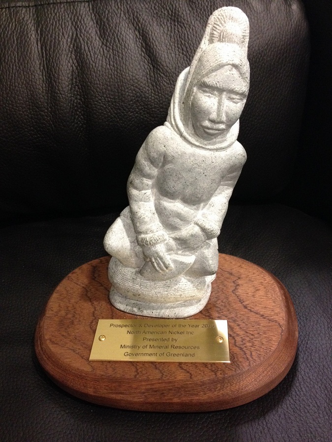 The award-prize is a soapstone figure with the inscription: ’Prospector and Developer of the Year in Greenland 2015, North American Nickel Inc., Presented by the Ministry of Mineral Resources, Government of Greenland’.