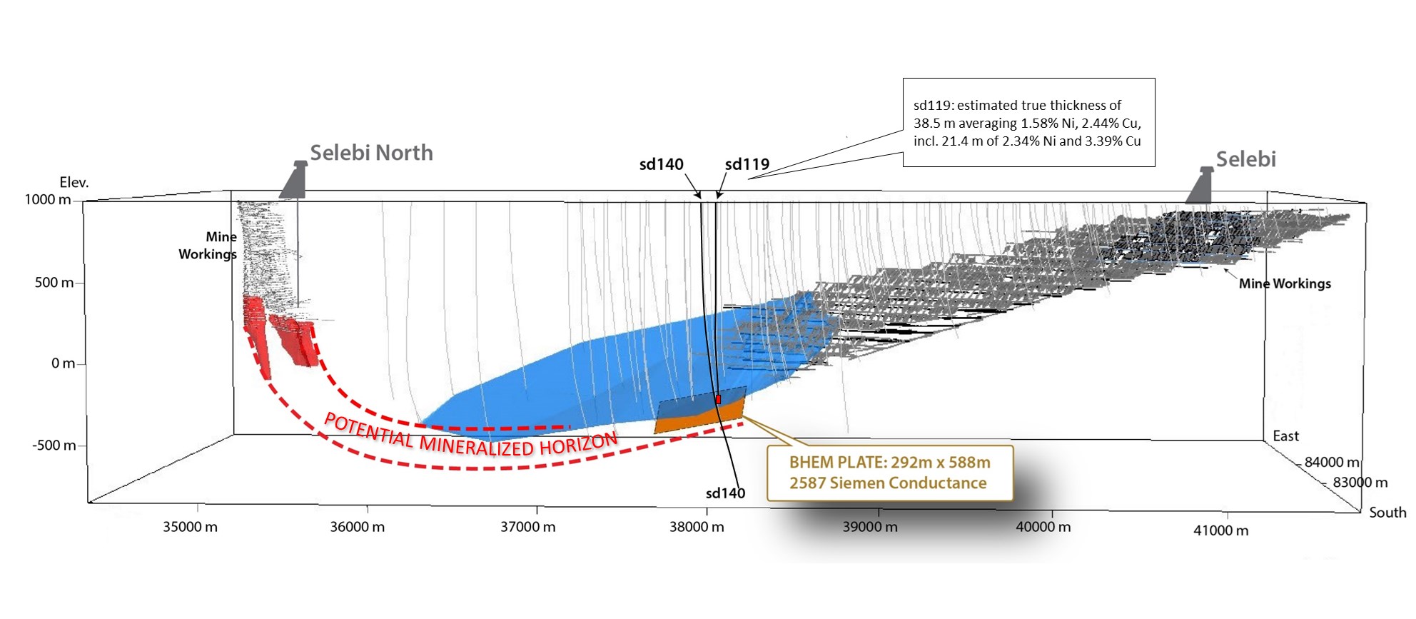 The highlight of the historic data compilation at Selebi was the identification of an off-hole borehole EM anomaly in sd140, a 2010 drill hole targeting down-dip of 1992 drill hole sd119 that reported an estimated true thickness interval of 38.5 metres averaging 1.58% Ni and 2.44% Cu, including 21.4 metres of 2.34% Ni and 3.39% Cu (figure 2), which management believes could be indicative of the presence of mineralization on the Selebi Mines property.