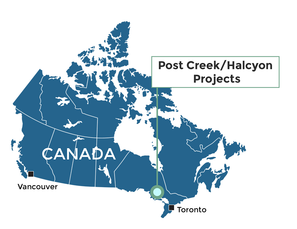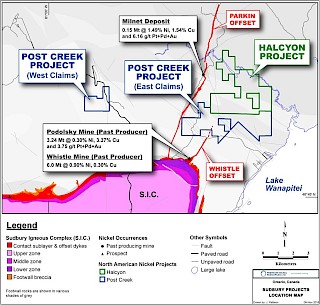 The Post Creek and Halcyon projects are located 35 km northeast of Sudbury in Norman, Parkin, Alymer and Rathburn townships (Figure 1). The Post Creek property consists of 56 unpatented mining claims covering an area of 912 hectares and the Halcyon property consists of 63 unpatented mining claim units totalling 864 hectares. Both properties are contiguous and readily accessible by paved, all-weather gravel, and bush roads. These two properties are strategically located approximately 2 km northeast of the past producing Podolsky Mine owned by KGHM International Ltd., a subsidiary of KGHM Polska Miedz S.A. The Podolsky 2000 and North deposits are both hosted within the Whistle Offset Dyke, which begins at the Sudbury Igneous Complex (past producing Whistle open pit mine) and trends northeast. It has been traced to the northern extent of the Podolsky Mine property, which is contiguous to the northeast with the Post Creek Property.